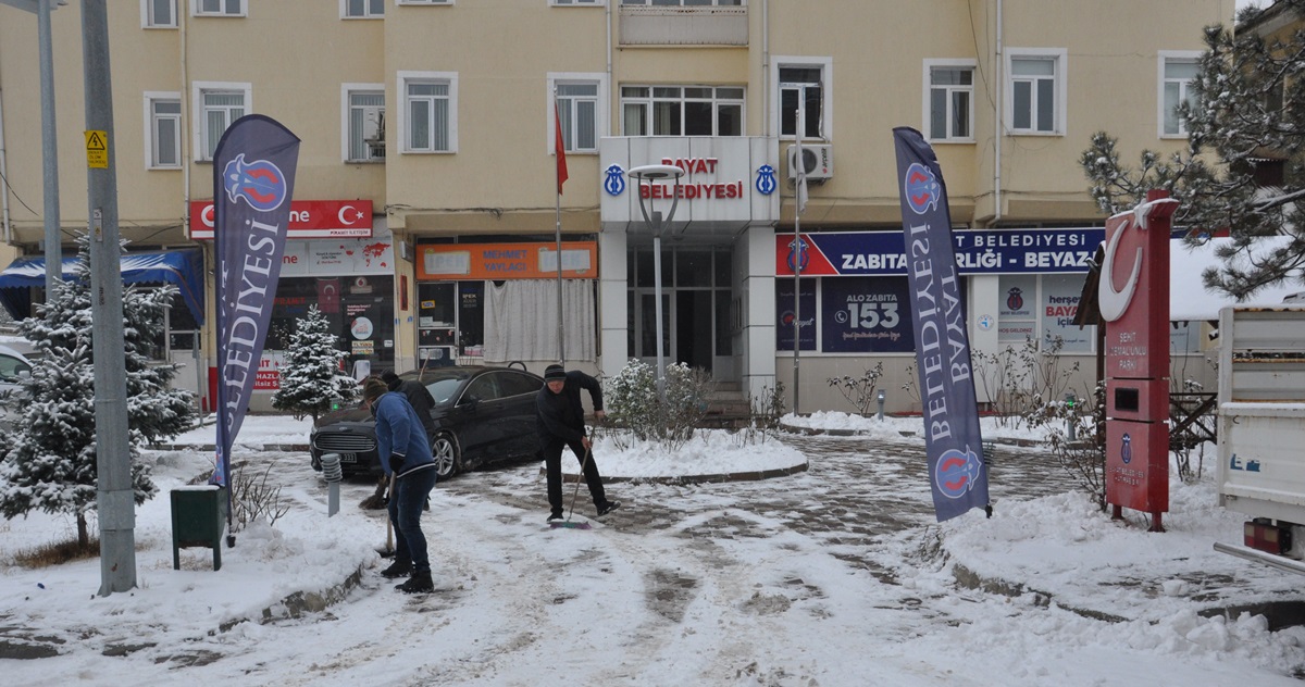 Çorum’un Bayat ilçesinde etkili olan kar yağışıyla birlikte belediyede teyakkuza geçti....