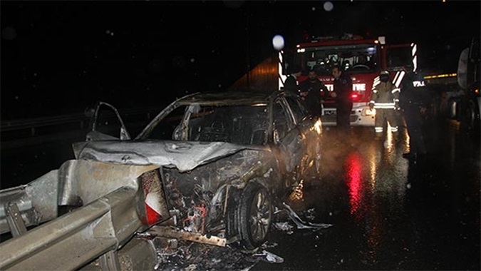 Çorum'da sürücüsünün direksiyon hakimiyetini kaybetmesi sonucu meydana gelen trafik kazasında otomobil cayır cayır yandı 2 kişi yaralandı....