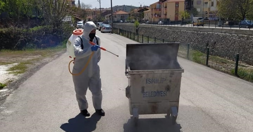 İskilip Belediyesi temizlik ekipleri koronavirüs, sinek ve koku oluşumuna karşı çöp konteynerlerini dezenfekte ediyor....